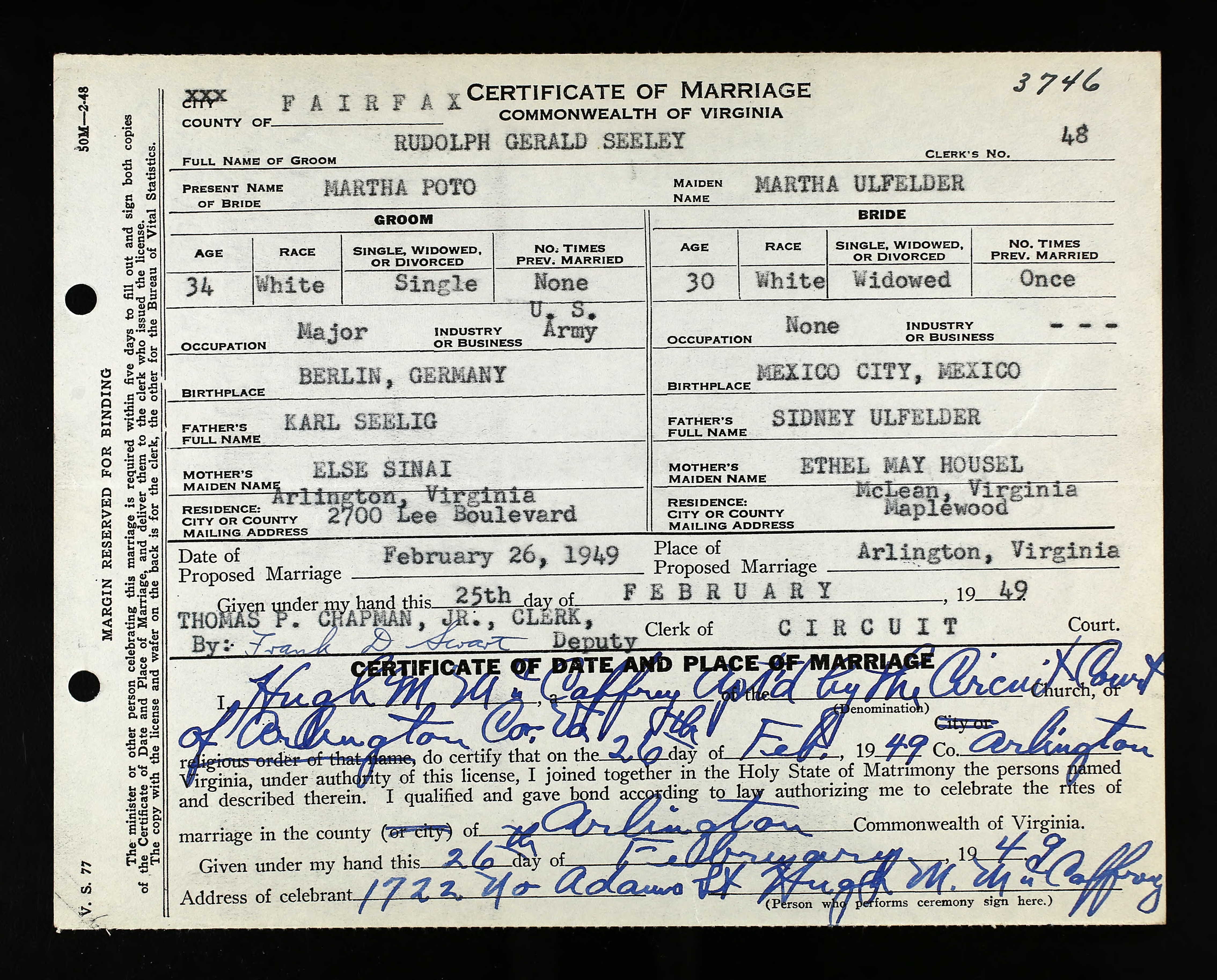 Home Surname List Name Index Sources Email Us | Family Group Sheet| HUSBAND | Rudolph Gerald Seeley-30653  | | BIRTH | calculated 1915 | Berlin, Germany | | DEATH | 4 January 1988 | McLean, Fairfax County, Virginia, United States of America | | MARRIAGE | 26 February 1949 | Arlington, Virginia, United States of America21384 | | | | WIFE | | Martha Ulfelder-213 |